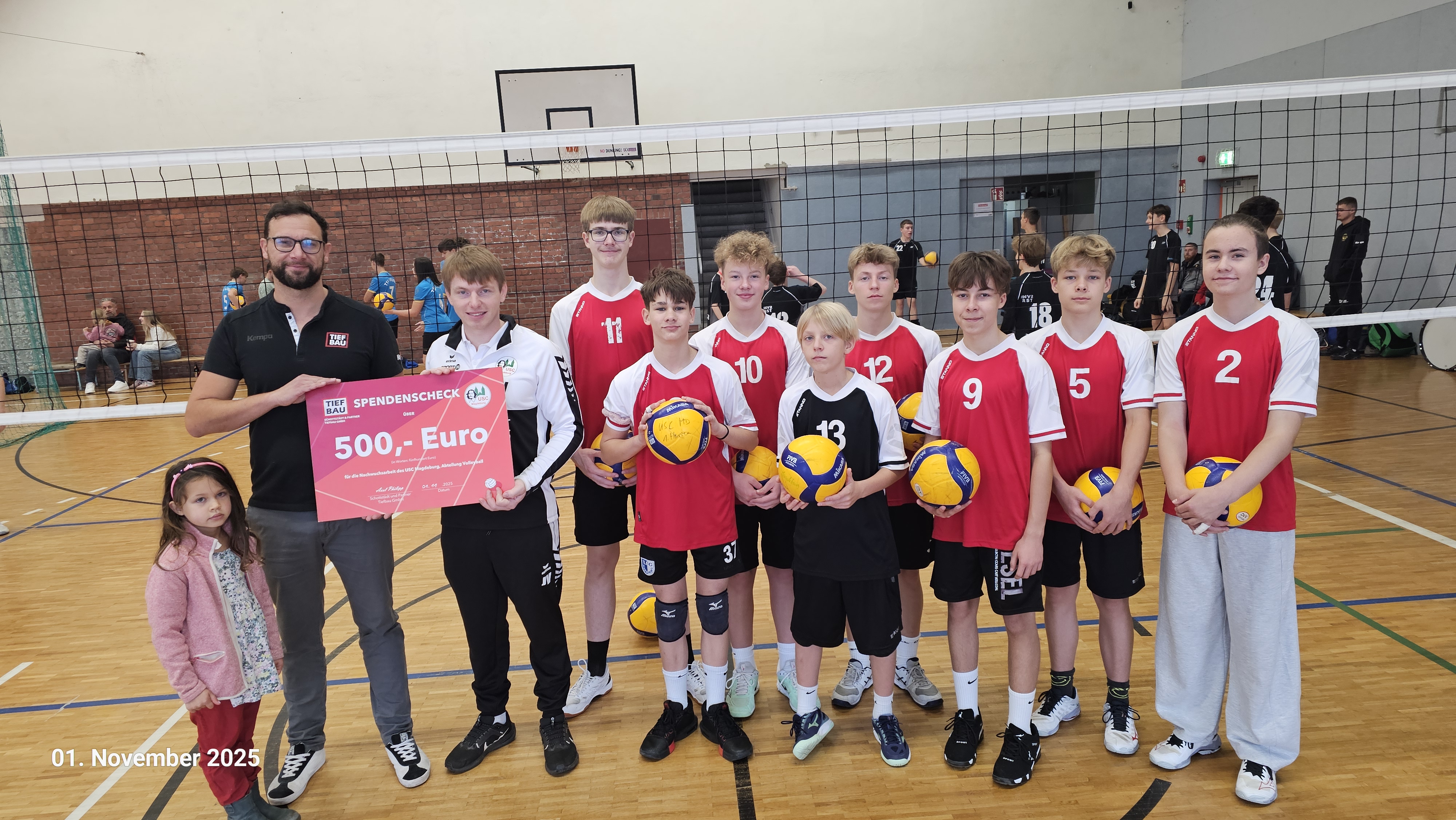 Bauleiter Torsten Biermann (links im Bild) übergab mit Tochter Marie den symbolischen Spendenscheck beim letzten Jugendspieltag an Trainer Jakob Vogel und das U16-Team des USC.